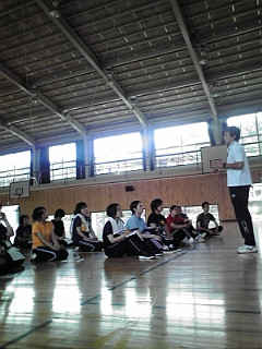 暑い中、待ち時間は、ホールの中で、運動教室。