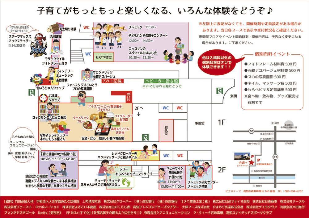 「子育てに学びとワクワク、感動を」をテーマに、高知の企業が集まって開催する子育てイベントです。昨年もたくさんのご来場とご好評をいただき、さらなるパワーアップを図りました。様々なものづくり、マックスライダー、子育ての制度やアレルギー・栄養について相談できるコーナー、楽器体験、プロの写真撮影やネイル&ハンドマッサージ、ベビーマッサージに足育、ベビーサイン体験会、かわいい雑貨やグッズの販売などなど盛りだくさんの内容が楽しめようになっています。