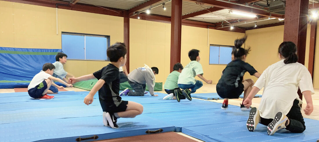 前転や後転などの種目を行う前に、体の使い方をおこないます。自分の体をコントロールすることが難しいと、いろんな動きに対応できません。まずは、楽しみながら、自分の体を自分でコントロールできるように、基礎運動脳力を高めていきます。
